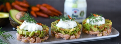 Tagliare il salmone a cubetti di 1cm. Grattugiare la scorza del lime e spremere il succo, tritare i peperoncini e mescolare con un pizzico di sale in una ciotola. Marinare il salmone per 10 minuti. Nel frattempo, tagliate metà dell'avocado, dello scalogno e del pomodoro a piccoli cubetti. In una ciotola, schiacciare l'altra metà dell'avocado con una forchetta. Mescolare tutti i cubetti con l'aglio tritato finemente e un po' di sale per fare la crema di avocado. Per la pasta di yogurt, grattugiare finemente lo zenzero e mescolarlo nello yogurt con un peperoncino tritato finemente e l'aneto. Condire a piacere con un po' di sale e pepe. Per servire, mettere il salmone in un anello di condimento sul fondo. Mettete la crema di avocado in cima e infine mettete una parte della pasta di yogurt nel mezzo, creando una piccola torre. Servire con del pane tostato.